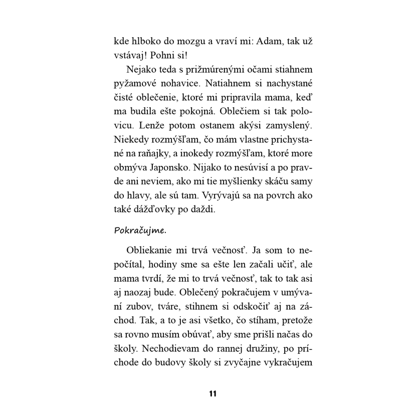 Adam s humorom opisuje, aké náročné je pre neho ranné vstávanie, povinná školská dochádzka, hŕba zošitov či nové slovo „inkluzívny“. Porovnáva svet chlapcov a dievčat, priznáva svoje malé finty pri učení a komentuje svoje školské povinnosti s detskou úprimnosťou i fantáziou. Hoci nerád spieva, miluje výtvarnú výchovu a dúfa, že raz napadne toľko snehu, že sa škola zavrie. Kniha je vhodná aj ako odporúčané čítanie, lebo citlivo a pútavo rozoberá detské emócie, rodinné vzťahy a dôležitosť empatie v spoločnosti.